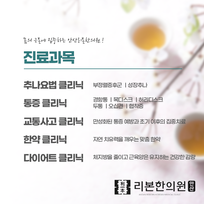교통사고는 사고로부터 4주간의 치료 과정이 무엇보다 핵심되어야 합니다. 차량의 파손에만 신경쓰지 말고, 건강 상태를 잘 확인하고 적극적으로 치료를 받으셔야 합니다. 초기의 적극적인 치료를 통해서 병변이 개선된 후에도 집중적인 치료가 이어지도록 해야합니다. 신속한 치료로 회복의 효과와 속도를 높여야 합니다. 통증이나 증상을 개선하고 만성화가 되지 않도록하고 재발을 예방해야 합니다. 몸의 근본에 집중하는 상록구주말한의원 안산리본한의원은 365일 진료가 가능하오니 편하게 내원하세요.