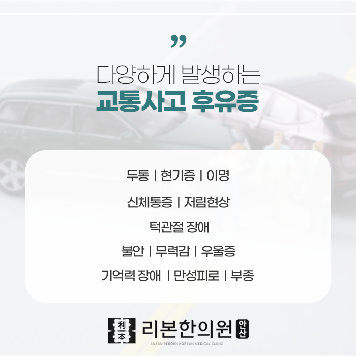 만약 치료가 제대로 되지 않거나 치료 시기가 늦어지면 증상은 만성화로 이어질 수 있고 2차적인 증상과 합병증으로 발전될 수 있습니다. 그렇기에 자연적으로 호전되기만을 기다리지 말고 바르게 치료를 받아야 합니다. 교통사고 후유증은 다양한 유형으로 나타납니다. 콕콕 찌르거나, 저릿저릿 저리고, 시큰시큰 시리며, 당기거나 쥐어짜는 등의 통증들이 발생합니다. 통증 뿐만 아니라 여러 가지 신체 이상 문제들이 발생하기도 합니다. 이명, 어지럼증, 두통, 현기증, 기억력장애, 턱관절장애, 식욕부진, 소화불량, 초조함, 예민함, 우울함, 무기력함, 가슴 두근거림, 부종, 수족냉증 등 다양한 증상들도 사고로부터 초래된 후유증으로 나타날 수 있습니다.