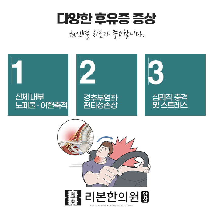 후유증은 지속되면 시간이 갈수록 더 심해지게 됩니다. 또한 병변이 개선된 후에도 명확하게 원인을 알 수 없는 증상들이 생기기도 합니다. 검사를 받아도 원인을 알 수 없는 증상은 ‘어혈’로부터 발생할 수 있습니다. 어혈은 출혈이 체외로 배출되지 않고 체내에 정체되거나 쌓이는 증상입니다. 이로 인하여 순환 체계가 방해받고 염증을 유발하여 통증이나 여러 불편함들이 발생하게 됩니다. 어혈은 CT나 MRI 등의 검사로도 확인이 어렵습니다. 한의학적 치료는 어혈 진단과 배출 및 제거의 긍정적인 효능을 기대해 볼 수 있습니다.