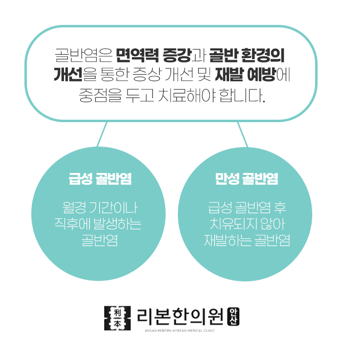 급성 염증은 개선이 되더라도 혈류가 부족해지고 조직의 손상 재생이 더뎌져 만성화가 될 수 있습니다. 순환이 방해된다면 염증 반응이 장기간으로 이어질 수 있고, 자궁의 부속기나 주변 조직까지 확산될 수 있으니 주의해야 합니다. 상록구 골반통증치료 안산리본한의원에서는 숙련된 한방 술기를 통하여 면역력을 높이고 골반강내의 환경을 개선합니다. 증상을 개선하는 것 뿐만 아니라 재발을 예방할 수 있도록 치료합니다. 급성인지, 만성인지를 올바르게 진단해야 그에 따른 치료 대처법도 다르게 적용될 수 있습니다.