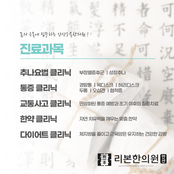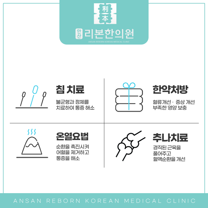 골반은 신체의 균형을 담당해주고 특히 여성분들에게는 중요한 구조이기 때문에 신경써서 잘 관리하도록 해야합니다. 몸의 근본에 집중하는 안산리본한의원의 한방 치룔르 통하여 건강을 회복하고 편안한 일상을 되찾으시길 바랍니다.
