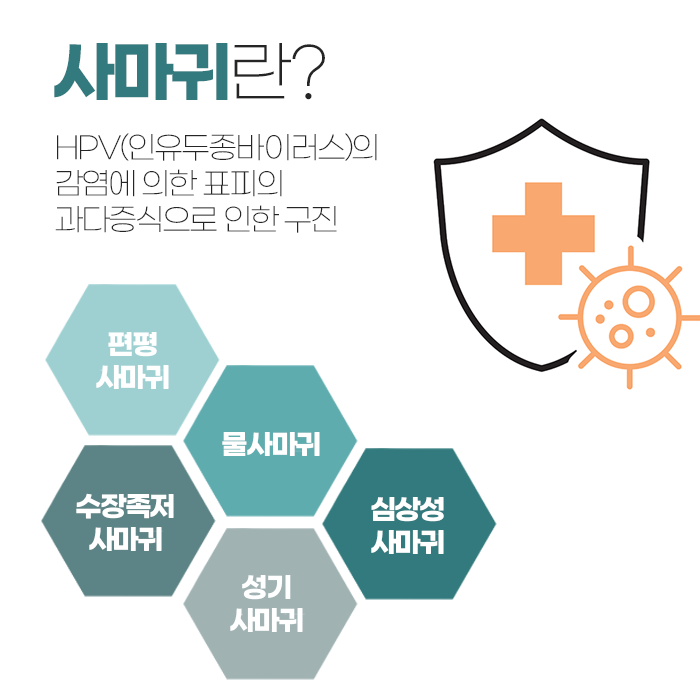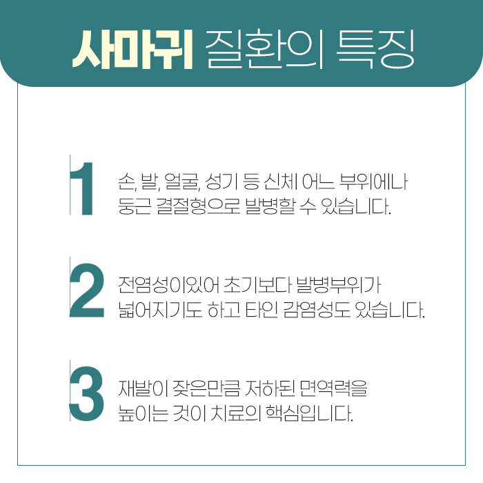 한번 발생하면 퍼지기 쉽고, 생긴 병변이 넓어지며 각질도 더욱 두텁게 쌓이게 됩니다. 또한 전염성을 지니고 있는 피부 질환이므로 초기에 치료해야 경과가 더욱 좋습니다. 한 부분의 사마귀를 자꾸 만지면 균이 옮게되어 다른 부위까지 퍼질 수 있으므로 주의해야 합니다. 또한 체내의 바이러스로 인하여 생긴 질환이기 때문에 각질 제거만으로는 치료가 되지 않고 오히려 악화될 수 있습니다. 따라서 안산사동 사마귀치료 빠른 한방치료를 통해서 피부의 안정을 되찾아 주는 것이 바람직합니다.
