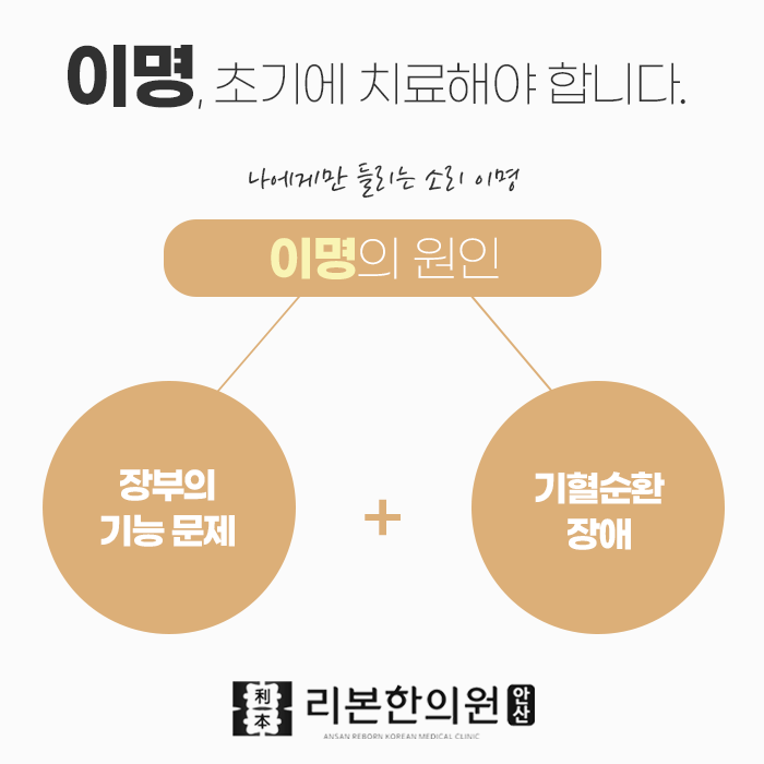 이명은 보통 귀의 구조적인 문제로 발병합니다. 소리를 전달하는 세포가 다양한 자극을 받아서 손상을 입게 됩니다. 이어폰, 해드폰 등을 많이 사용하고 지속적인 소음에 노출되고, 특정 행생제를 장기 복용하거나, 노화, 노폐물이나 독소 축적 등 다양한 원인으로 세포가 손상되면서 발생하게 됩니다. 그리고 외적인 손상으로 골격이 불균형해지거나 신경이 눌리면서 청신경의 영향을 받고, 잘못된 생활습관으로 인해서 이명을 느끼게 됩니다.