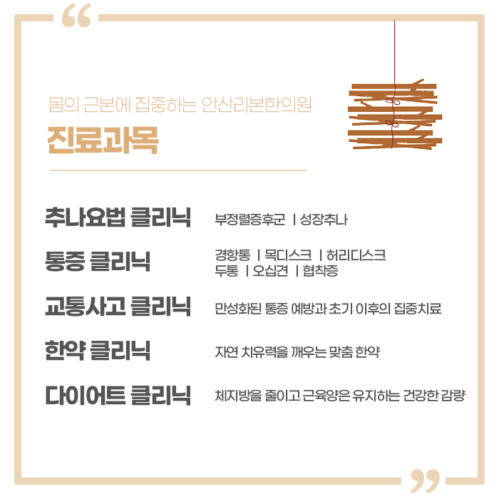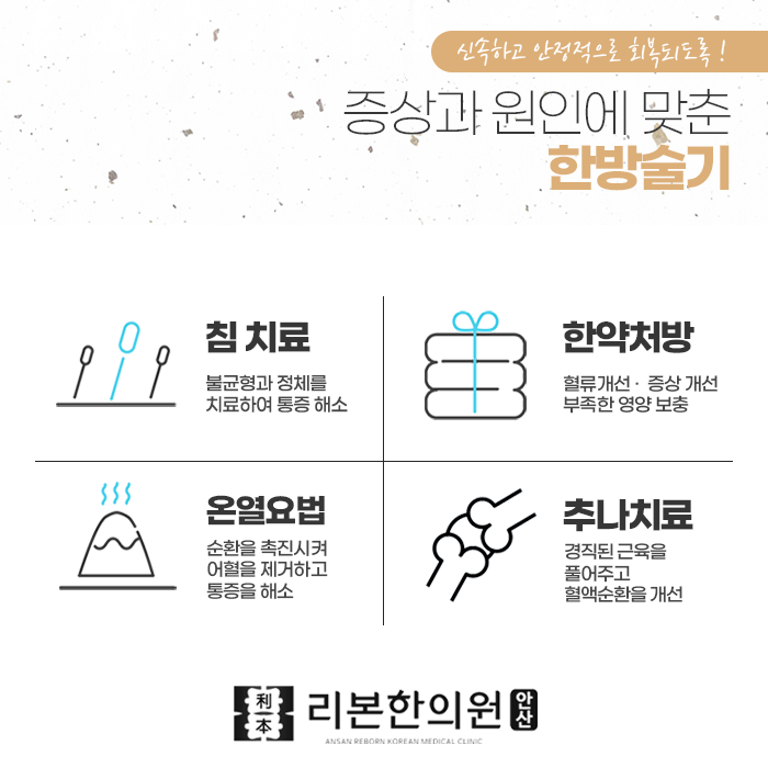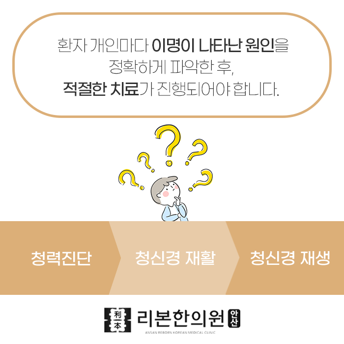 같은 진단, 같은 증상이라도 환자마다 다른 이명의 원인을 파악하여 치료해야 합니다. 몸의 근본에 집중하는 안산리본한의원에는 청력을 잘 살피고, 청신경의 활과 재생을 촉진시킵니다. 이명 외에도 다양한 통증, 질환, 한방내과, 한방부인과, 한약처방, 교통사고 후유증 클리닉 등 여러 가지 진료를 도와드립니다.