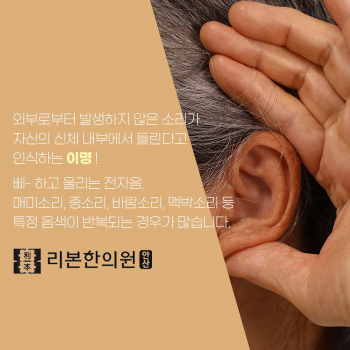 게다가 증상이 심해지면 2차적인 증세로 발전될 수 있으므로 주의해야 합니다. 대표적인 이명 증상은 삐-하는 전자음과 같은 소리, 종소리, 맥박소리, 바람소리, 매미소리 등 여러 가지 소리 중에서 특정 음성이 반복됩니다. 이명 증상을 호소할 경우 안산 이명 치료 도와드리는 안산리본한의원 통해 근본적으로 다스려 보시길 바랍니다.