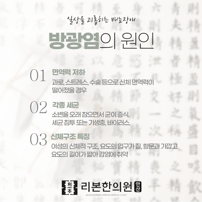 잔뇨감 외에도 다양한 증상으로 유발되는 배뇨장애와 방광염은 수면부족, 과로, 스트레스 등으로 면역 체계가 불안정하여 유발됩니다. 그리고 재발의 반복으로 인하여 면역력이 저하되는 것이 근본적인 원인이기에 자연스럽게 호전이 어려울 수 밖에 없습니다. 짧은 기간 안에 심각한 수준으로 발병하지는 않지만 시간이 지나면서 점점 재발이 반복되고 통증이 커지고, 증상이 심해집니다. 상록구 잔뇨감 한방치료는 원인, 증상, 개인체질, 건강상태, 환경 등에 맞추어 체계적으로 치료합니다. 한방 치료는 긴장된 방광 상태를 튼튼하게 회복해주고 염증 개선을 통하여 제기능을 되찾습니다.