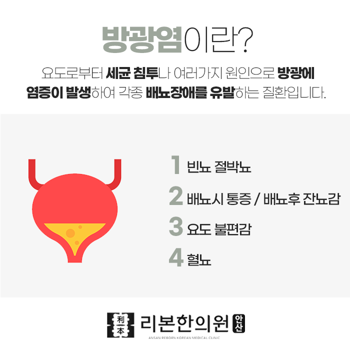 방광은 소변을 저장하고 적절하게 배출해주는 중요한 기능을 담당하고 있습니다. 하지만 여러 원인으로 방광에 염증 반응이 생기면서 제기능을 잃게되는 경우들이 많습니다. 그러면 계속 소변이 마렵다고 느껴지는 증상을 호소하게 되고, 소변을 보고 난 후에도 시원하게 느껴지지 않고, 다시 소변이 마렵다고 느끼게 됩니다. 이러한 증상은 ‘잔뇨’ 라고 합니다. 이 외에도 여러 가지 배뇨장애 증상들이 동반되기도 합니다. 배뇨장애는 일상 생활을 불편하게 하면서 삶의 질을 저하시킵니다. 게다가 스트레스가 높아지게 되면서 심리적인 증상까지 발전될 수 있습니다.