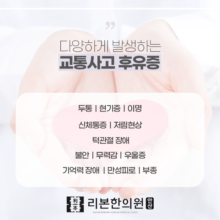 교통사고 후 올바르게 치료되지 않고, 치료 시기가 늦어진다면 점점 증상이 만성화되고, 2차적인 증세 또는 합병증까지 발생할 수 있으므로 주의가 필요합니다. 자연스럽게 괜찮아지겠지 라고 생각하지 말고 신속한 치료가 중요합니다. 교통사고로 인한 후유증은 유형도 다야합니다. 콕콕 찌르고, 저릿저릿 저리고, 시큰시큰 시리며, 쥐어짜고 당기는 듯한 통증 등이 있습니다. 통증 뿐만 아니라 여러 가지 증상들이 동반될 수 있습니다. 이명, 기억력 장애, 턱관절 장애, 두통, 현기증, 어지럼증, 식욕부진, 소화불량, 속 메스꺼움, 구토, 부종, 수족냉증, 무기력함, 가슴 두근거림, 우울함, 초조함, 예민함 등의 여러 가지 증세들도 사고로부터 야기되는 후유증에 속할 수 있습니다.