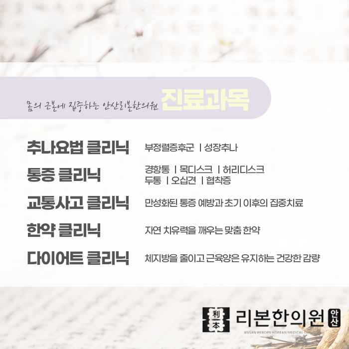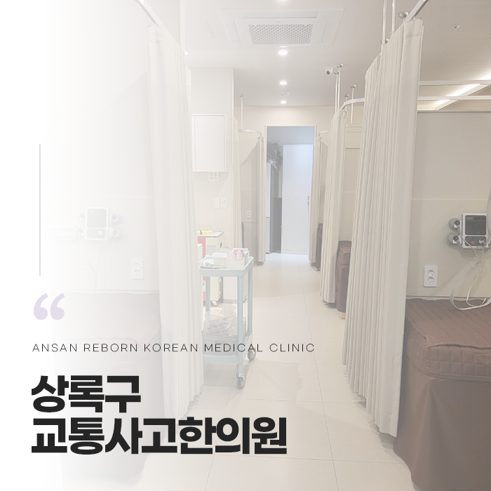 교통사고는 사고일로부터 4주 동안의 치료 과정이 가장 중요합니다. 건강 상태를 꼼꼼하게 체크하고 적극적으로 치료해야 합니다. 초기 치료로 병변을 개선하고 집중적인 치료가 이어져야 합니다. 신속한 치료를 통해서 회복 속도와 효과를 높여야 하고 통증 및 증상을 개선하며 만성화 및 재발을 예방해야 합니다. 몸의 근본에 집중하고 있는 상록구한의원 365일 문이 열려있으니 편하게 내방하여 주세요.