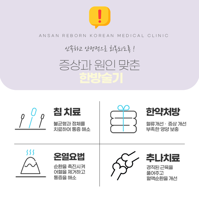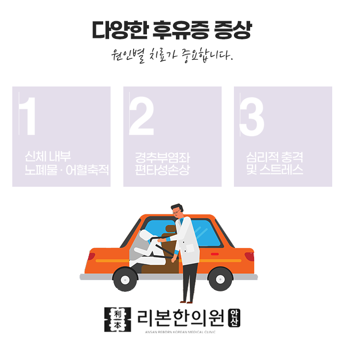후유증은 방치될수록 점점 심해집니다. 또한 병변이 개선된 뒤에도 원인을 알 수 없는 증상들이 발생하기도 합니다. 검사를 통해서도 확인하기 어려운 증상들의 원인, ‘어혈’을 의심해 볼 필요가 있습니다. 이는 사고 때문에 미세 혈관이 파열되었지만 출혈이 발생하여 체내에 쌓이고 정체되는 현상을 의미합니다. 그러므로 순환 체계가 방해를 받게되고 염증이 생기면서 통증이나 여러 가지 불편함들이 생깁니다. MRI, CT 등의 검사로도 발견이 힘든 어혈은 한방 치료로 배출하고 제거하는데 긍정적인 효과를 기대해 볼 수 있습니다.