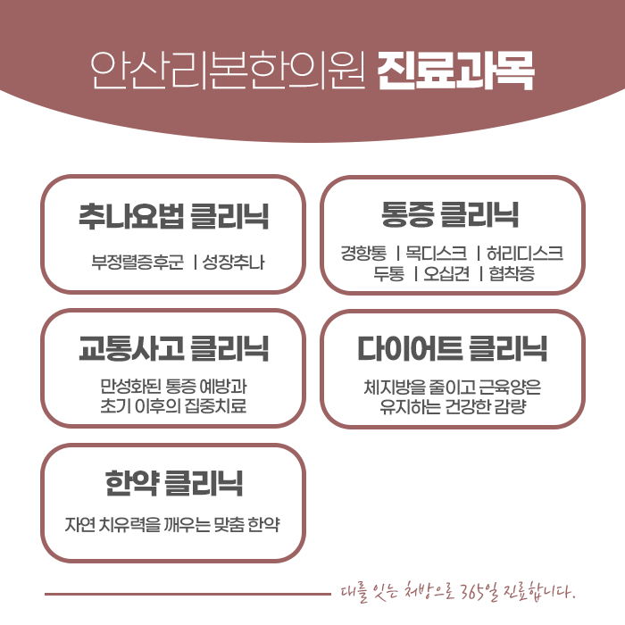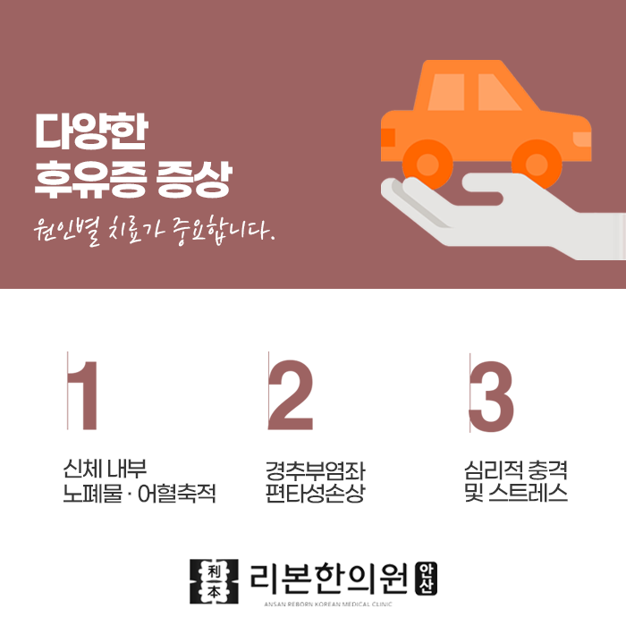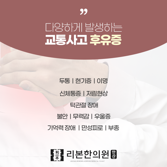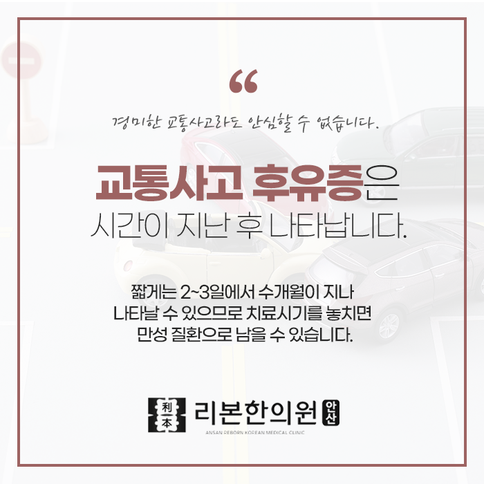 결론적으로, 교통사고 이후에는 반드시 본인의 몸 상태를 면밀히 살피고, 작은 변화라도 놓치지 않도록 해야 합니다. 통증이나 불편함이 작다고 해서 무시하면 더 큰 문제로 이어질 수 있으며, 적절한 시기에 치료를 받는 것이 장기적인 건강을 지키는 지름길입니다. 사고 후에는 상록구야간진료한의원 적극적인 치료와 꾸준한 관리를 통해 후유증을 예방하고, 몸과 마음 모두의 회복을 도모하는 것이 중요합니다.