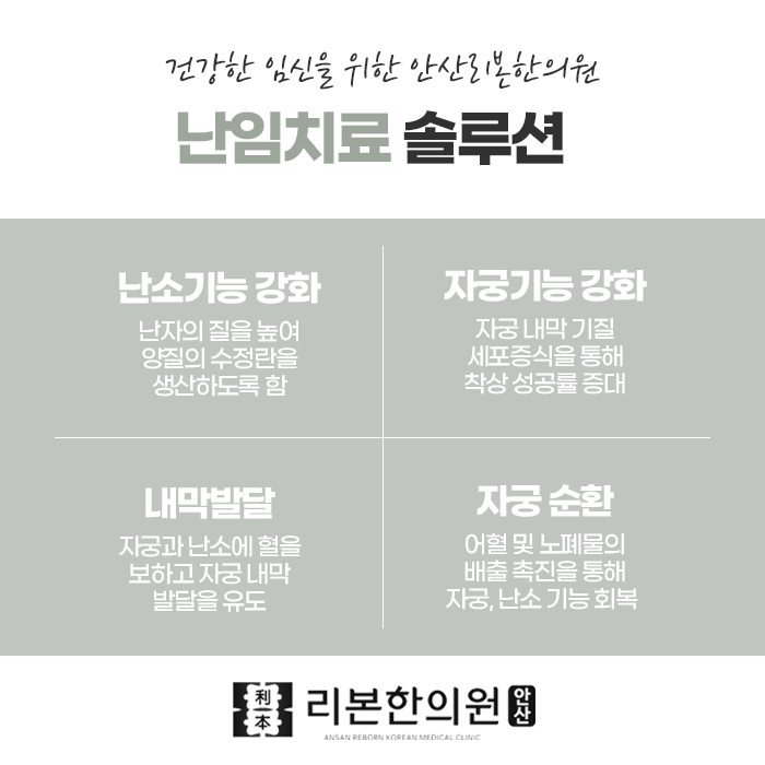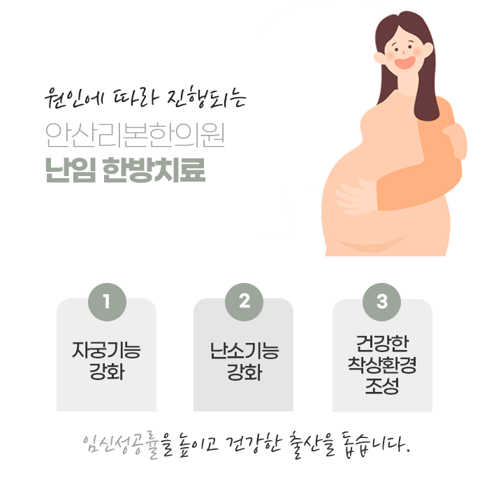 특히 여성의 경우, 검사상 특별한 이상이 발견되지 않는데도 임신이 잘 이루어지지 않는 경우가 있습니다. 이때 한의학에서는 ‘자궁냉증’이 원인일 수 있다고 봅니다. 자궁냉증은 몸이 차가워져 자궁 주변 혈류가 원활하지 않아 발생하는데, 몸을 따뜻하게 하고 순환을 개선하는 치료가 필요합니다. 안산리본한의원은 침 치료를 통해 기혈순환을 촉진시키고, 자궁 내막과 난소의 혈류를 개선하여 난소의 기능을 높여줍니다. 이와 함께 상록구 난임 한방관리를 통해서 개인의 체질과 건강 상태를 정밀하게 진단한 뒤 1:1 맞춤 처방을 진행합니다.