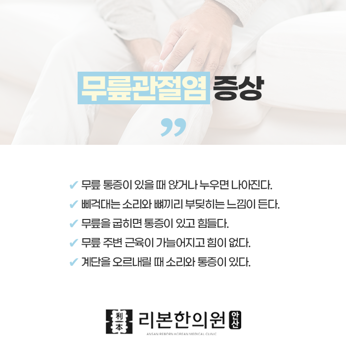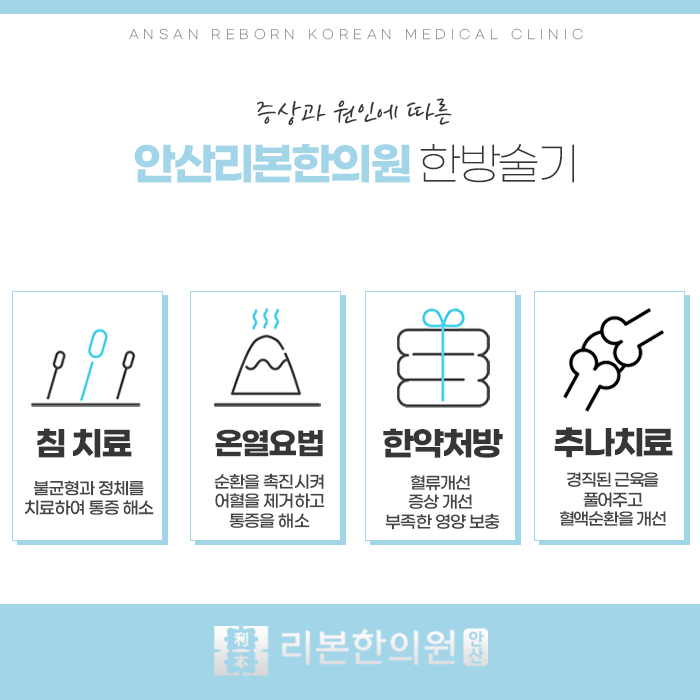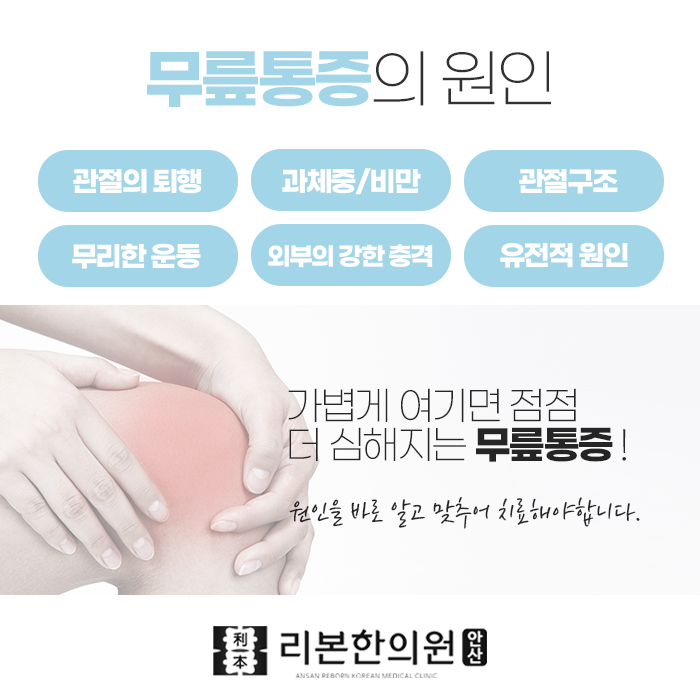 무릎은 일상에서 가장 많이 사용되는 관절이자 우리 몸을 지탱하는 중요한 역할을 하는 만큼, 통증을 느끼면 반드시 정확한 진단과 치료가 필요합니다. 안산리본한의원에서는 개인의 상태와 증상에 따라 맞춤형 한방치료를 통해 무릎 통증의 원인을 개선하고 건강한 일상으로 회복할 수 있도록 도와드립니다.
