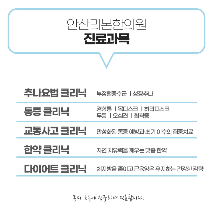 또한 수술 이후에도 통증을 호소하는 분들에게도 도움을 드리고 있습니다. 수술 후 조직 유합 과정에서 발생하는 통증을 줄이고, 주변 근육과 인대의 기능 회복을 돕도록 한방 치료를 병행하여 재활을 돕습니다.