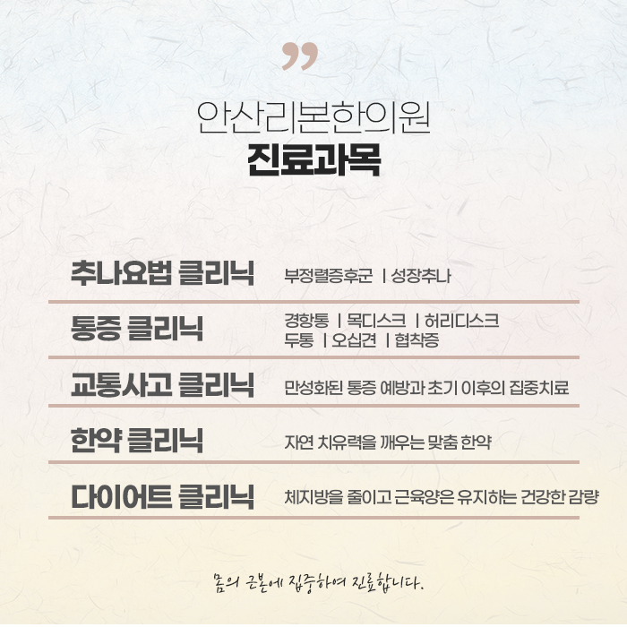 내 몸의 상태를 정확히 파악하고 체계적인 치료를 통해 건강한 일상으로 복귀하는 것이 중요합니다. 사고는 누구에게나 갑자기 닥칠 수 있으므로, 초기 증상이 가볍다고 방심하지 말고 전문가의 진료를 받아야 합니다. 안산리본한의원에서는 교통사고로 인한 다양한 신체적·정신적 증상에 대해 정밀하게 진찰하고, 한방적 접근을 통해 몸의 밸런스를 회복할 수 있도록 돕고 있습니다. 근본적인 원인을 중심으로 진료하며, 환자의 전반적인 건강 회복을 목표로 합니다. 안산리본한의원의 세심한 진료와 함께 교통사고 후유증 없이 건강을 되찾으세요.