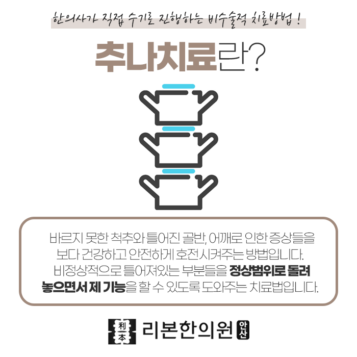 또한 한의사가 수기로 시행하는 추나요법은 관절의 정렬을 바르게 잡고, 경직된 조직을 유연하게 풀어주며, 정상적인 운동범위를 되찾도록 돕습니다. 치료 과정에서 염증 완화, 혈류 개선, 조직 유연성 증가를 우선적으로 시행한 뒤 점차 어깨 주변의 근력을 강화하고 움직임을 회복시켜 재발을 방지할 수 있도록 치료 및 관리까지 함께 합니다.