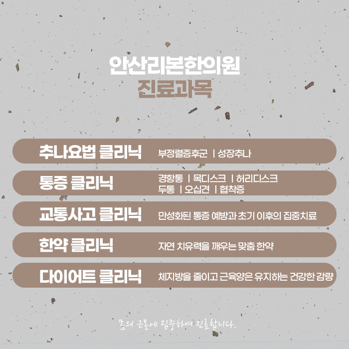 안산리본한의원은 연중무휴로 운영되고 있어 평일 야간이나 주말에도 편리하게 내원할 수 있는 체계를 갖추고 있습니다. 또한 교통사고 후유증, 자세 교정, 한방 다이어트, 소화장애 등 다양한 프로그램을 함께 운영하고 있으므로, 몸의 전반적인 건강을 점검하고 싶은 분들에게도 도움을 드릴 수 있습니다. 어깨 관절의 문제를 방치하지 말고 체계적이고 안전한 한방 치료를 통해 일상의 자유로움을 되찾으시길 바랍니다. 오랜 경험과 정성스러운 진료를 바탕으로 몸의 근본에 집중하고 있는 안산리본한의원과 함께라면 통증에서 벗어나 편안한 움직임을 되찾을 수 있을 것입니다.
