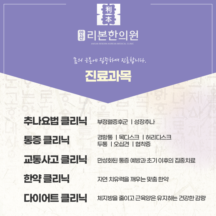 감정적인 불안정이 계속될 경우 한약이나 심신안정요법을 병행하여 정서 회복을 유도하기도 합니다. 안산사동일요일한의원 안산리본한의원은 교통사고로 인한 다양한 증상과 후유증을 조기에 파악하고, 전신적인 회복을 목표로 한 치료를 이어가고 있습니다. 단순한 통증 완화에 그치지 않고, 사고 전의 건강한 몸 상태로 돌아갈 수 있도록 신경쓰고 관리하도록 해야합니다.