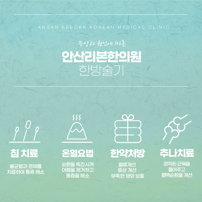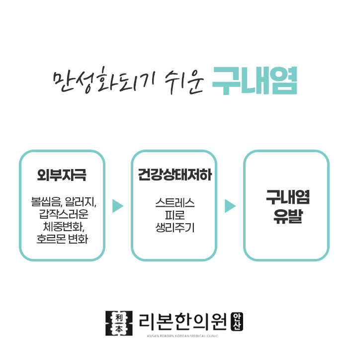 구내염은 그 자체만으로도 고통스럽지만, 반복되거나 만성화되면 삶의 질이 떨어지고 전신 건강에도 영향을 줄 수 있습니다. 하지만 곧 괜찮아지겠지 라고 생각하고 안일하게 여기는 경우들이 많은데요. 하지만 구내염이 자주 발생한다는 것은 몸이 보내는 이상 신호일 수 있으므로, 이를 방치하지 말고 조기에 적절하게 상록구 구내염치료 를 받는 것이 필요합니다. 몸의 근본에 집중하여 진료하고 있는 안산리본한의원에서는 평일 야간진료와 주말 진료도 가능하므로 바쁜 일상 속에서도 편안한 치료를 받으실 수 있습니다. 체질과 증상에 맞춘 진단과 한의학적 처방을 통해 구내염의 고통에서 벗어나 건강한 일상을 되찾아보시길 바랍니다.