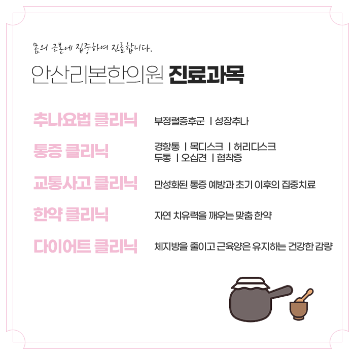안산공휴일한의원 안산리본한의원은 단순한 통증 완화에 머물지 않고, 환자의 몸 전체 상태와 일상생활까지 고려한 맞춤형 치료를 진행하고 있습니다. 초기에는 사소해 보일 수 있는 증상이라도 방치하지 않고 빠르게 대응하는 것이 후유증을 줄이는 최선의 방법입니다. 몸이 보내는 작은 신호라도 귀 기울이고 적절한 치료를 통해 빠른 회복과 일상 복귀를 이끌어내는 것이 중요합니다. 몸의 근본에 집중하여 진료하는 안산리본한의원을 통하여 회복에 도움을 받아보시길 바랍니다.
