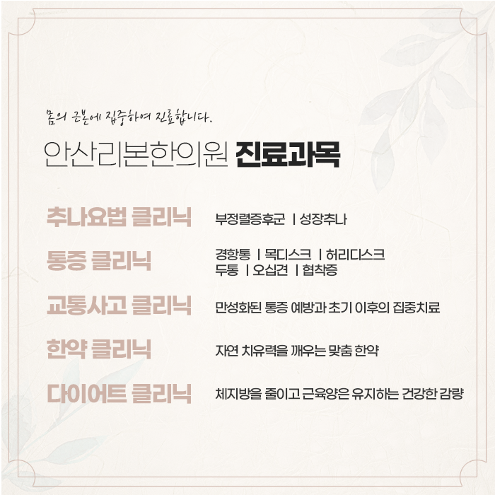 상록구한의원 안산리본한의원은 환자의 빠른 회복과 건강한 일상 복귀를 위해 체계적인 진단과 치료 계획을 바탕으로 진료를 진행하고 있습니다. 겉으로 아무 이상이 없어 보여도 몸속에서는 여러 변화가 일어나고 있을 수 있으므로, 조기에 정확한 검진과 치료를 받는 것이 가장 현명한 방법입니다. 교통사고 후에도 몸과 마음이 안정적으로 회복될 수 있도록, 세심하게 진료하며 함께하겠습니다.