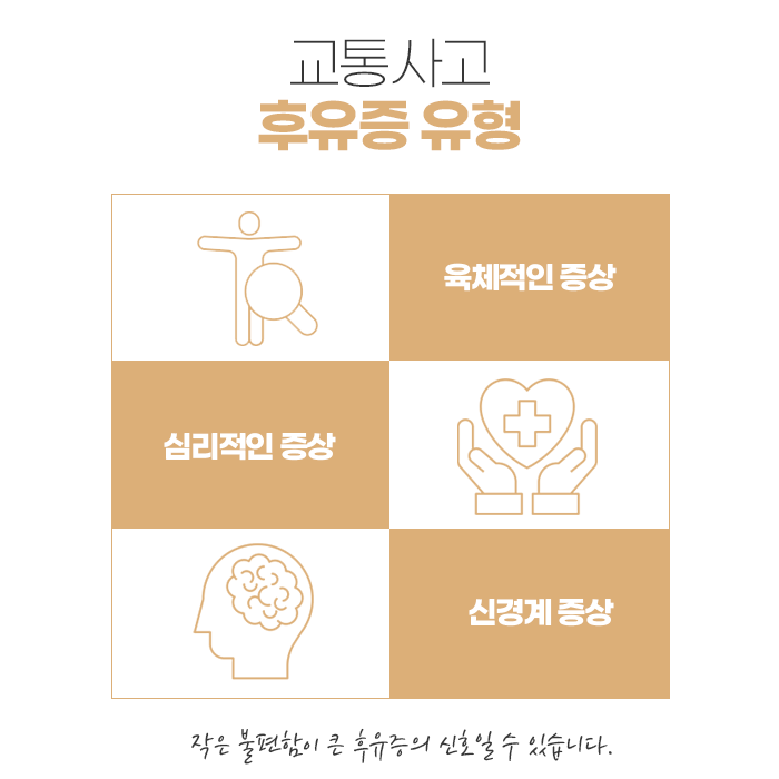 교통사고는 일상의 흐름을 순식간에 끊어놓는 예상치 못한 사건입니다. 사고 순간에는 큰 부상이 없다고 느낄 수 있지만, 시간이 지나며 몸의 다양한 부위에서 불편함이 서서히 나타나는 경우가 많습니다. 이는 사고 당시의 긴장 상태로 인해 통증 감각이 일시적으로 무뎌지기 때문입니다. 그래서 사고 직후 “괜찮다”고 판단했다가 며칠 후 목이나 허리, 어깨 등이 뻐근하거나 저리는 증상으로 병원을 찾는 분들이 많습니다. 사고 충격은 외관상 문제가 없어 보여도 근육과 인대, 관절에 눈에 보이지 않는 미세 손상을 남기며, 이로 인해 염증이 생기고 기능 저하가 뒤따를 수 있습니다.