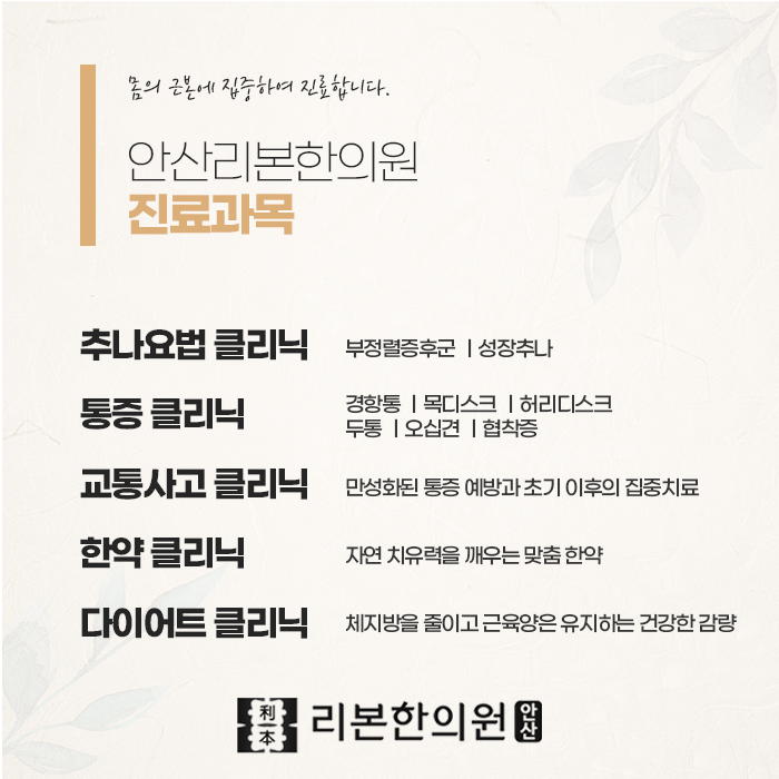 작은 증상이라도 반복된다면, 그 신호를 가볍게 넘기지 마세요. 빠르게 확인하고 치료를 받는 것이 후유증을 줄이고 건강한 상태로 돌아가는 가장 좋은 방법입니다. 안산사동한의원 은 몸속 깊은 변화까지 함께 살펴보며, 단기적인 통증 해소는 물론 재발 방지를 위한 꾸준한 관리까지 이어갑니다. 사고 이전보다 더 건강한 몸으로 회복될 수 있도록, 정성과 체계적인 치료를 만나보실 수 있습니다. 편안한 공간에서 안정감을 느끼며 치료받고 싶은 분들께, 안산리본한의원이 함께 회복을 돕겠습니다.
