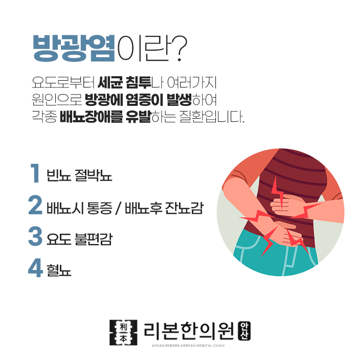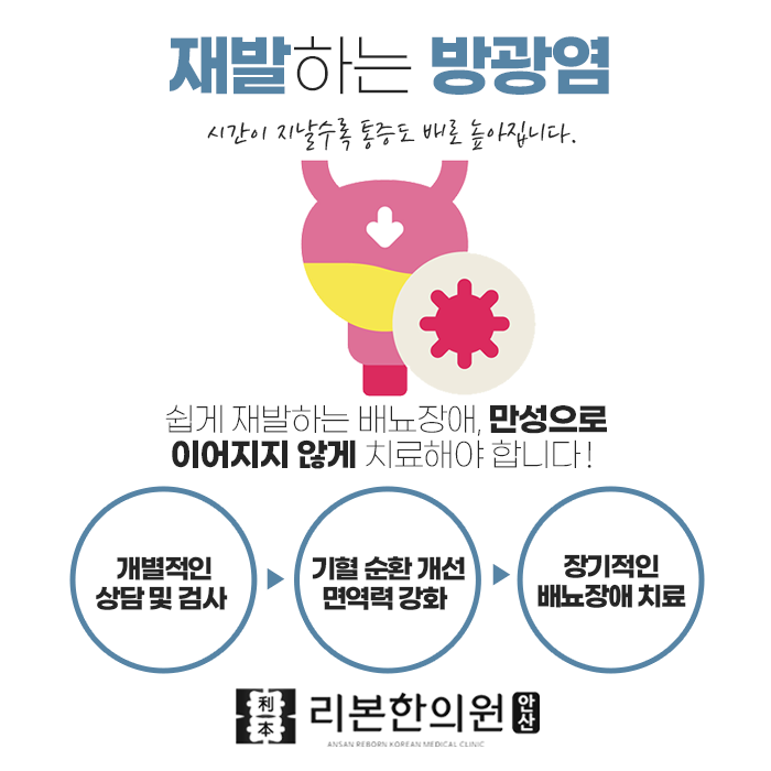안산 배뇨장애치료 안산리본한의원에서는 단순히 증상만을 치료하는 것이 아니라, 환자의 체질과 생활 환경에 맞춘 세심한 접근으로 근본적인 원인을 해결하고 있습니다. 방광염은 시간이 지나면 저절로 낫는 가벼운 질환으로 여겨지기 쉽지만, 이를 방치하면 만성화되거나 재발할 수 있기 때문에 초기 치료가 중요합니다. 안산리본한의원은 환자의 체질에 맞는 맞춤형 치료를 통해 방광염이 재발하지 않도록 도와주며, 환자에게 건강한 일상을 되찾을 수 있도록 지원하고 있습니다. 반복적인 방광염이나 만성적으로 고생하고 있다면, 더 이상 증상을 방치하지 말고 조기에 내원하여 정확한 진료와 꾸준한 치료를 통해 건강하고 편안한 일상을 되찾으시길 바랍니다.