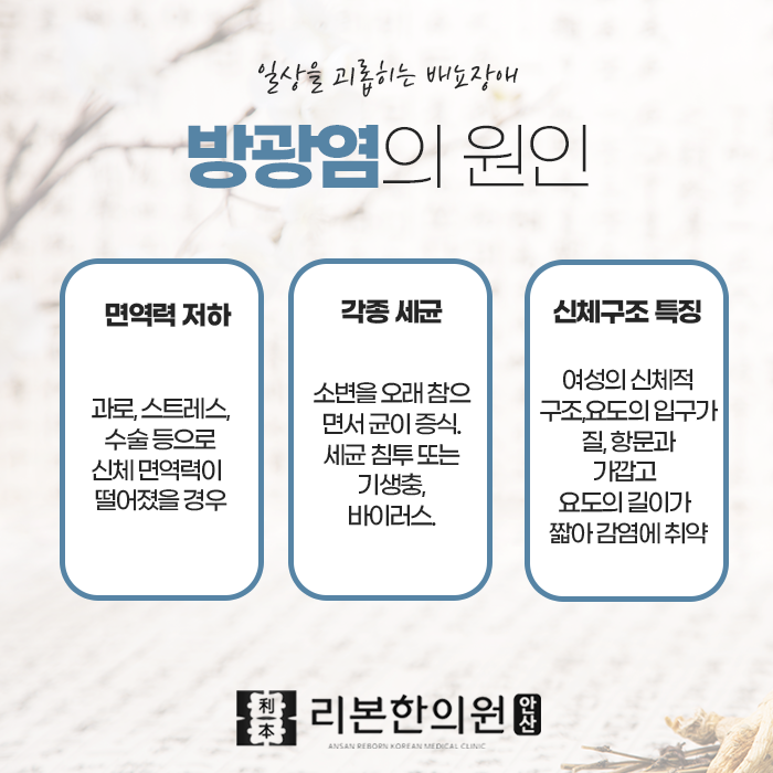 안산 배뇨장애치료 도와드리는 안산리본한의원에서는 방광염을 단순한 세균 감염으로 보는 것이 아니라, 면역력 저하, 순환 장애 등 신체 전반적인 문제로 접근하고 있습니다. 방광염을 치료할 때는 단순히 증상을 완화하는 것에 그치지 않고, 재발을 방지하고 몸의 전반적인 건강을 개선하는 데 초점을 맞추고 있습니다. 한약, 침, 약침, 뜸, 부항 등을 활용하여 방광 주변 염증을 가라앉히고 혈류 순환을 개선하며, 전신의 균형을 회복하는 방법을 제시합니다. 특히 한약은 환자의 체질과 현재 증상을 종합적으로 고려해 맞춤 처방됩니다. 이를 통해 염증을 완화하는 것뿐만 아니라, 면역력 향상과 자율신경의 균형을 맞추고 내장 기능을 회복시키는 데 기여합니다.