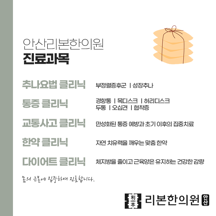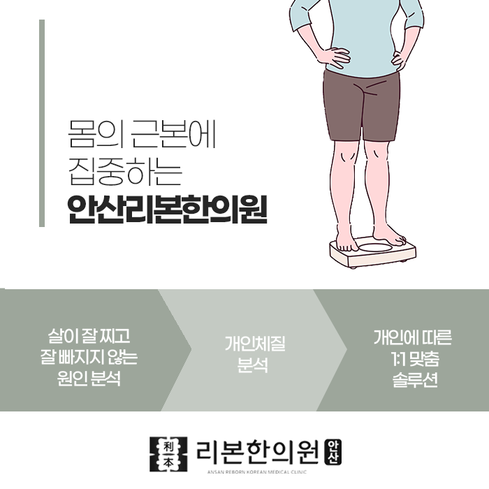 단기 목표에 급급하지 않고, 오랫동안 유지할 수 있는 생활 습관을 개선하는 솔루션까지 함께 도와드리고 있습니다. 몸의 근본에 집중하여 진료하고 있는 안산리본한의원에서 성공적인 감량에 도전하시고, 자신감을 찾아보시길 바랍니다.