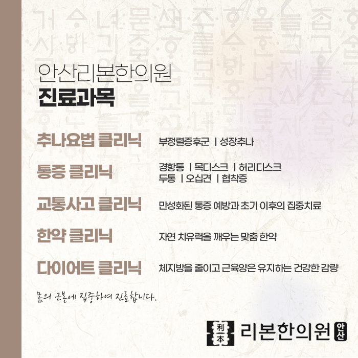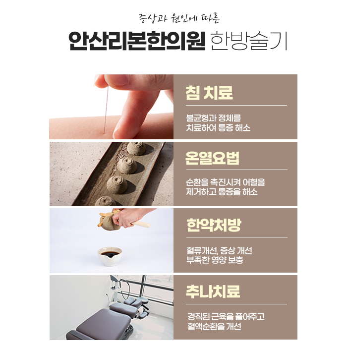 추나요법 또한 중요한 치료법입니다. 이는 무릎 관절 주변의 구조적 균형을 바로잡아 자연스러운 움직임을 되찾도록 돕습니다. 잘못된 자세나 체형으로 인해 무릎에 부담이 쌓였던 부분을 교정하는 역할을 하며, 무릎에 가해지는 압력을 줄여줍니다. 한약 역시 중요한 치료법으로, 관절 염증을 가라앉히고 인대나 연골 조직의 회복을 돕는 성분들로 구성됩니다. 특히 무릎이 자주 붓거나 열감을 동반하는 경우, 한약을 통해 몸의 기운을 조절하고 순환을 개선하는 효과를 기대할 수 있습니다. 만성적인 통증이나 오래된 무릎 불편감을 겪고 있는 분들, 심지어 수술 후에도 증상이 지속되는 경우, 보다 체계적인 안산 퇴행성관절염 치료를 통해 회복을 도울 수 있습니다. 몸의 근본에 집중하는 안산리본한의원 통해 무릎 건강을 지켜보시길 바랍니다.