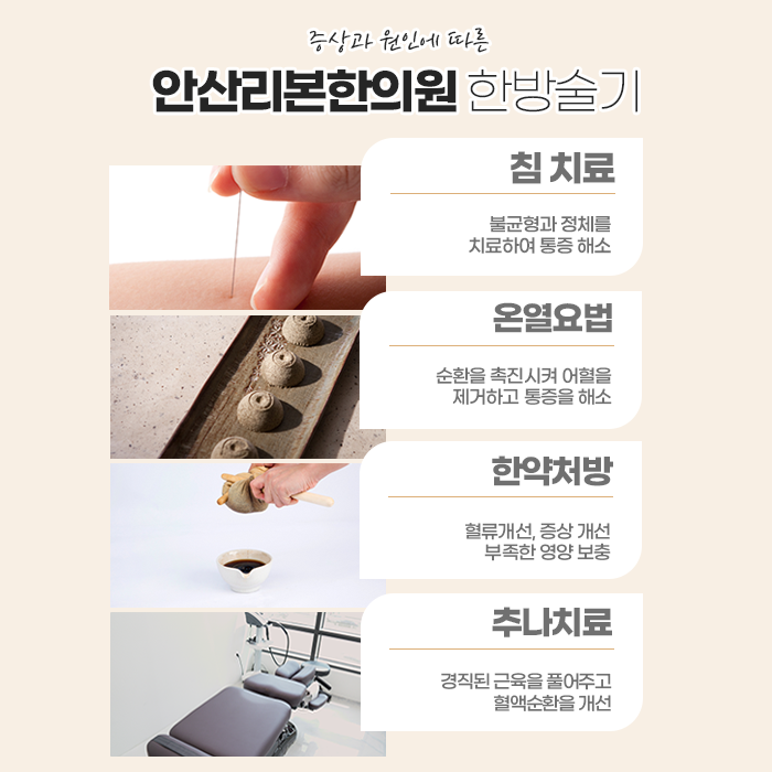 한방을 통한 상록구 허리디스크 치료 과정은 허리 통증의 원인을 단순히 국소적인 문제로 보지 않고, 신체 전체의 균형 문제로 접근합니다. 기혈 순환을 개선하고, 근육과 인대의 기능을 회복시켜 자연적인 회복을 돕는 치료법에 초점을 맞추고 있습니다. 침 치료는 긴장된 근육을 이완시키고 기혈 순환을 촉진해 통증을 완화하는 데 효과적입니다. 약침 치료는 한약 성분을 통증 부위에 직접 주입하여 염증을 줄이고 회복을 가속화하는 데 도움을 줍니다. 또한, 한약은 염증을 완화하고 손상된 신경에 영양을 공급하여 몸의 자연 치유력을 증진시킵니다. 개인의 체질과 증상에 맞춘 맞춤형 처방이 가능하며, 만성 통증에도 효과적으로 작용합니다.