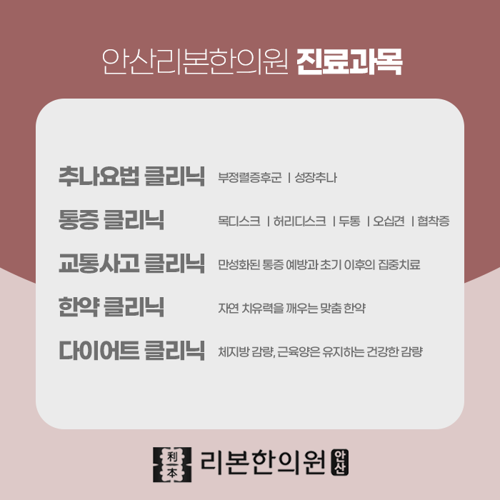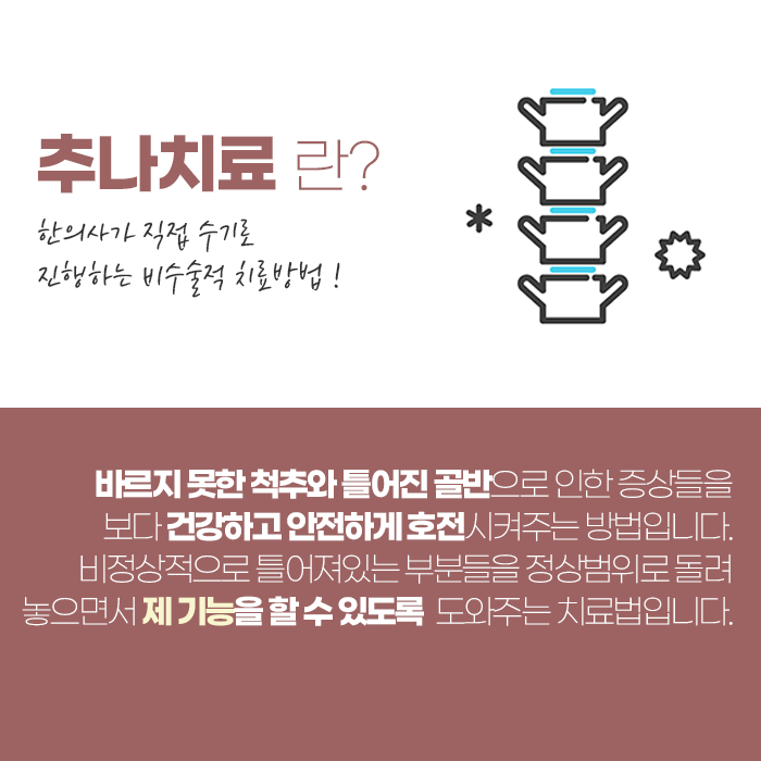 특히 추나요법은 한의사가 손으로 직접 시행하는 비수술적 치료로, 척추의 배열을 바로잡아 주어 불균형을 개선하고 통증을 완화하는 데 효과적입니다. 시술자의 숙련도에 따라 치료 효과가 달라질 수 있기 때문에 전문성과 경험을 갖춘 의료진의 진단과 솜씨가 중요합니다. 안산리본한의원은 숙련된 한의사가 정확한 진단 하에 안전하게 추나치료를 시행하고 있습니다. 추나요법은 한의사가 직접 수기 및 도구를 이용하여 불균형하거나 비틀어진 부분을 개선해주는 치료로 비정상적으로 틀어진 구조를 정상 범위로 회복시키고 본래 기능을 되찾게 돕습니다.