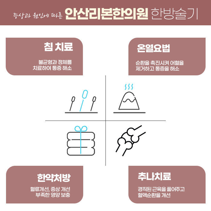 한의학적 접근하는 안산사동 목디스크치료 안산리본한의원에서는 침, 약침, 뜸, 부항, 물리치료, 추나요법, 맞춤 한약 처방 등 다양한 치료 기법을 통합적으로 적용하는 것이 특징입니다. 염증이 발생한 부위의 염증 반응을 감소시키고 순환을 원활하게 하여 통증을 해소하며, 근육 및 인대를 부드럽게 개선하여 줍니다. 환자마다 통증의 원인과 유발 동작, 생활 환경이 다르므로 개인별로 세심하게 평가한 뒤 그에 맞는 치료 계획을 세웁니다. 목을 돌리거나 뒤로 젖히거나 앞으로 숙일 때 등 개인마다 통증이 발생하는 동작과 통증의 유형 등을 꼼꼼하고 면밀하게 검사하여 통증의 원인을 파악하고, 체질과 증상에 맞춘 맞춤형 진료를 제공합니다.