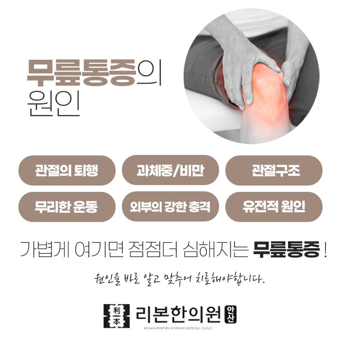 무릎 관절이 손상되면 회복되기 어렵습니다 그러므로 단계가 더욱 진행되지 않도록 관리하면서 증상을 개선시켜 생활이 편리할 수 있는 방향으로 치료가 진행되어야 합니다. 이러한 회복에 시간이 오래 걸리기 때문에, 증상이 가볍더라도 조기에 관리하는 것이 무엇보다 중요합니다. 안산리본한의원 한방 치료를 시작해 보시길 바랍니다.