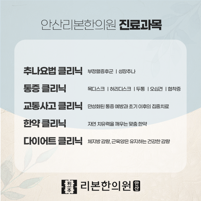 질염이 반복되면 일상생활에 큰 불편을 주는 것은 물론이고, 방치할 경우 자궁 질환이나 난임과도 연결될 수 있으므로 빠른 조치가 필요합니다. 여성으로서의 건강은 삶의 질과 직결됩니다. 질염 증상이 의심된다면 단순히 참고 넘기지 말고, 본인의 상태에 맞는 적절한 치료를 받아야 합니다. 안산리본한의원은 365일 진료와 평일 야간 진료를 운영하고 있어 바쁜 일상 속에서도 편리하게 상담 및 치료를 받을 수 있습니다. 건강한 질 환경을 되찾고, 재발 걱정 없는 일상을 원하신다면 지금 바로 한방 치료의 도움을 받아보시기 바랍니다.