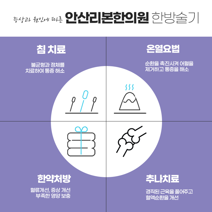 한약과 침, 약침, 뜸 치료 등을 통해 하복부의 혈류 개선과 염증 완화에 도움을 줍니다. 특히 항생제를 사용하지 않고도 몸의 면역 기능을 강화하고, 재발하지 않도록 도와주는 것이 특징입니다.