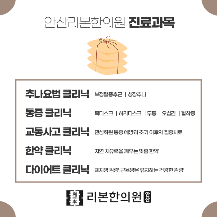 지금의 몸 상태를 정확히 이해하고 싶다면, 단순한 체중 수치 대신 ‘몸의 균형’을 살펴보세요. 나에게 맞는 한방 다이어트를 통해 건강한 순환과 안정된 에너지를 되찾을 수 있습니다. 다이어트가 고통이 아닌 회복의 과정이 되도록, 안산리본한의원에서 체질에 맞춘 새로운 변화를 시작해보시기 바랍니다.