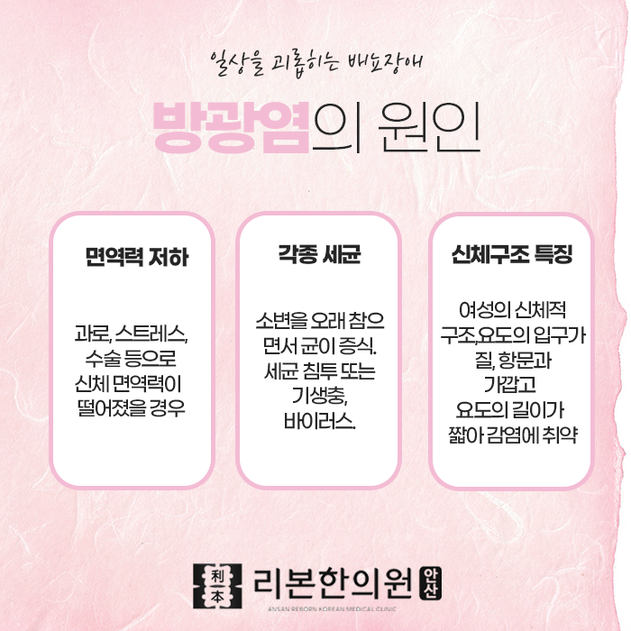 일반적으로 방광염은 세균이 요도를 통해 방광에 침입하면서 발생합니다. 특히 여성은 요도의 길이가 짧고 항문과의 거리가 가까워 세균 감염이 쉽게 일어나기 때문에 발병률이 높습니다. 하지만 단순한 외부 감염만이 원인은 아닙니다. 과도한 스트레스, 수면 부족, 과로, 냉기 노출, 호르몬 불균형 등으로 면역력이 약해질 때에도 방광 점막의 방어 기능이 저하되어 염증이 생기기 쉽습니다. 처음에는 소변이 자주 마렵거나 가벼운 따가움 정도로 시작하지만, 이를 방치하면 염증이 깊어지고 재발을 반복하는 만성 형태로 발전할 수 있습니다. 따라서 증상이 미약하더라도 몸의 상태를 정확히 파악하고 근본 원인을 다스려야 합니다.