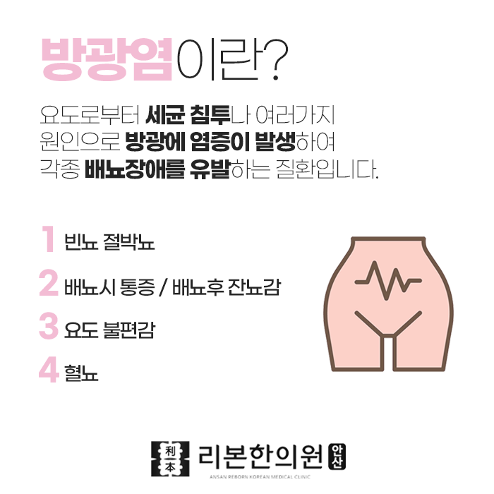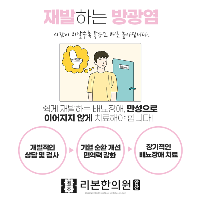 방광염은 일상에서 흔히 접할 수 있는 비뇨기 질환 중 하나이지만, 그 불편함은 결코 가볍지 않습니다. 소변이 자주 마렵게 느껴지는 빈뇨, 잔뇨감이 남는 듯한 느낌, 배뇨 시 따가움과 통증이 동반될 때 일상의 리듬은 크게 흔들립니다. 증상이 악화되면 하복부의 묵직한 통증이나 혈뇨, 허리통증으로까지 번질 수 있으며, 잦은 재발로 이어지면 만성 방광염으로 진행되어 치료가 더 어려워질 수 있습니다. 이런 이유로 방광염은 단순히 ‘일시적인 불편감’이 아니라, 몸의 균형이 무너졌다는 신호로 인식하고 조기에 정확한 상록구 빈뇨치료 를 받는 것이 중요합니다.