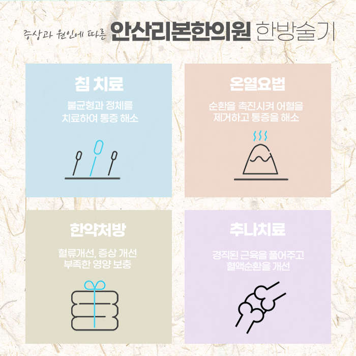 이와 함께 봉침 치료는 벌에서 추출한 천연 성분으로 염증 완화와 통증 감소를 목표로 하는 치료법으로 빠른 효과가 필요할 때 적용됩니다. 추나요법 역시 무릎 주변의 구조적 불균형을 바로잡아 체형으로 인한 관절 부담을 덜어주는 중요한 안산 무릎관절염치료 방법 중 하나입니다.