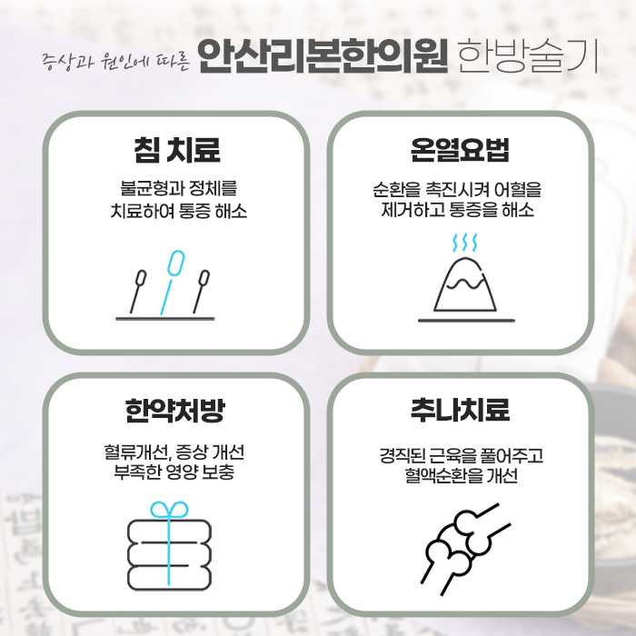 침 치료는 손상된 근육과 인대를 이완시키고, 혈류를 개선하여 염증을 줄이는 데 효과적입니다. 막혀 있던 어혈이 풀리면 통증이 완화되고, 조직 재생이 원활하게 이루어집니다. 여기에 한약 치료를 병행하면 체내 에너지를 보충하고 면역 기능을 높여 피로감과 무기력함을 해소할 수 있습니다. 한약은 개인의 체질과 증상에 따라 조제되며, 자극적이지 않고 자연스러운 회복을 돕는 것이 특징입니다.