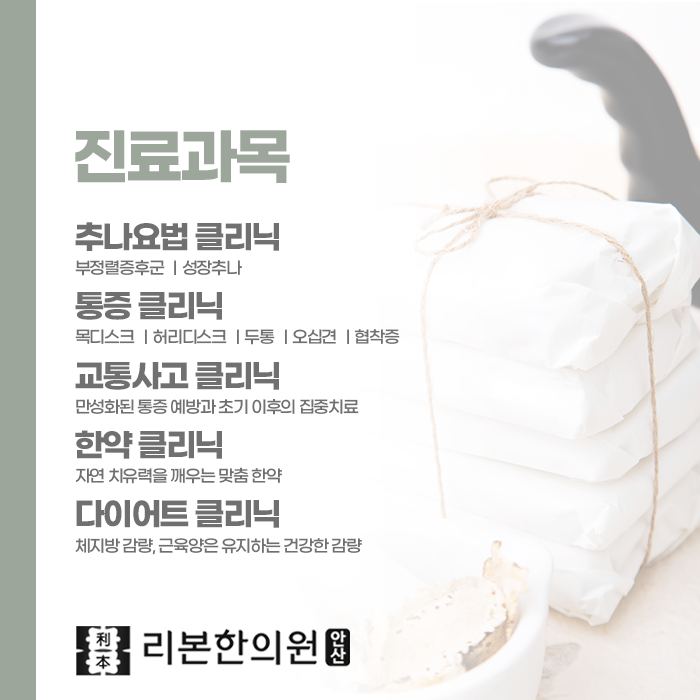 안산 알레르기치료 및 비염치료는 단순한 코 증상이 아니라, 신체가 보내는 면역 불균형의 경고 신호입니다. 일시적으로 증상을 가라앉히는 방법보다는 체질을 바로잡고 면역력을 강화해 근본적인 변화를 이끌어내는 것이 무엇보다 중요합니다. 안산리본한의원은 풍부한 임상 경험을 바탕으로 개인의 생활패턴과 체질, 증상 양상을 종합적으로 분석해 지속적인 관리와 치료를 제공합니다. 계속되는 알레르기 증상이나 비염으로 일상 속 불편함이 크다면 전문적인 검진과 치료를 받아보는 것이 좋습니다. 안산 알레르기치료 를 통해 무너진 면역을 회복하고 건강한 호흡을 되찾아, 더 편안한 일상으로 돌아갈 수 있습니다.
