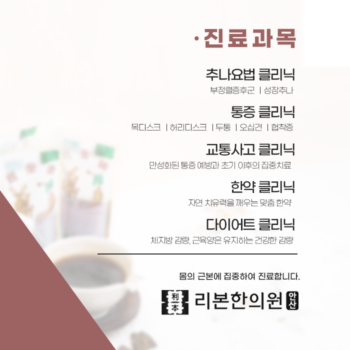 가장 중요한 것은 작은 변화라도 주의 깊게 살피고, 필요할 때 전문가의 도움으로 흐트러진 몸의 리듬을 바로잡는 것입니다. 사고로 인한 긴장과 스트레스는 근육을 더욱 경직시켜 통증을 악화시키기도 하므로 일정 기간 꾸준한 관리가 필요합니다. 몸의 회복 과정에 맞춰 치료 강도와 생활 리듬을 조절하면 통증 악화를 막고 안정적인 회복을 유지할 수 있습니다. 미세한 불편함이라도 가볍게 넘기지 말고 적극적으로 관리한다면 후유증 없이 일상으로 돌아가는 데 큰 도움이 됩니다. 상록구일요일한의원 안산리본한의원의 세심한 진단과 지속적인 치료는 건강한 일상 복귀를 더욱 빠르게 만들어 줍니다.